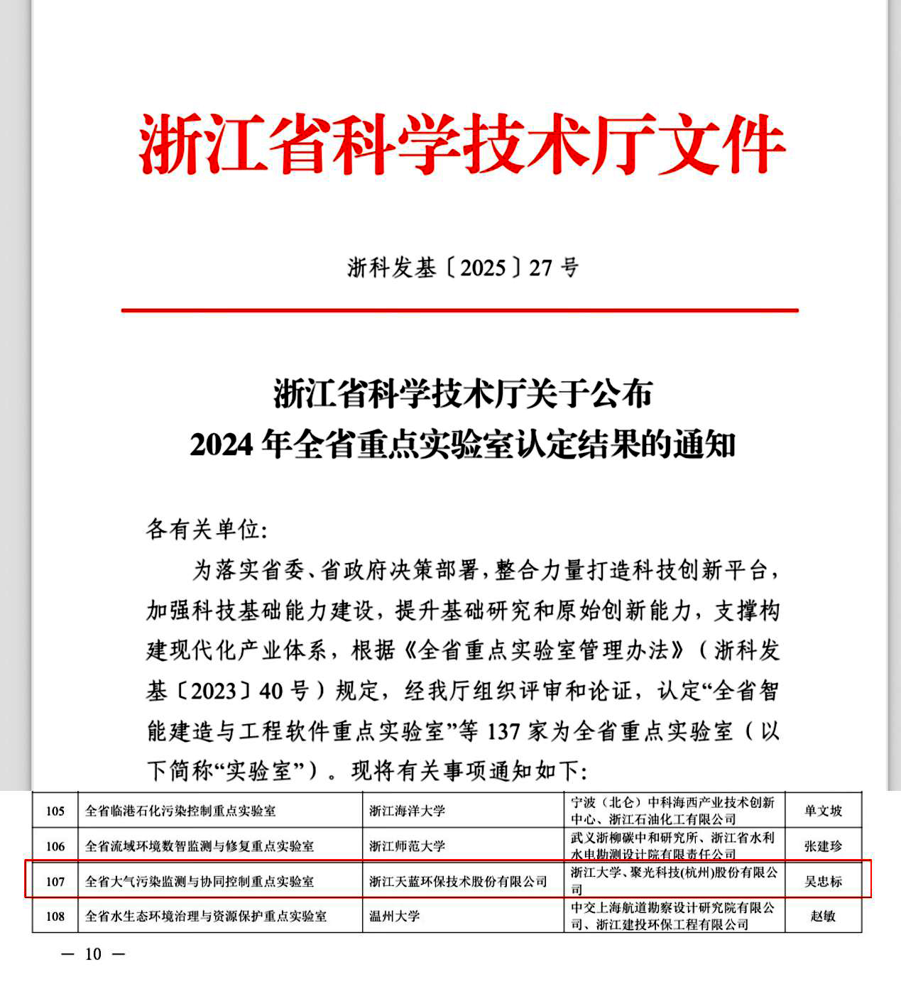2025年6月4日,浙江省科技廳發(fā)布《浙江省科學(xué)技術(shù)廳關(guān)于公布2024 年全省重點實驗室認定結(jié)果的通知(浙科發(fā)基〔2025〕27號)》,由浙江天藍環(huán)保技術(shù)股份有限公司牽頭,浙江大學(xué)和聚光科技(杭州)股份有限公司共建的“全省大氣污染監(jiān)測與協(xié)同控制重點實驗室”獲批組建,成為全省環(huán)境領(lǐng)域唯一以企業(yè)牽頭建設(shè)的省級重點實驗室